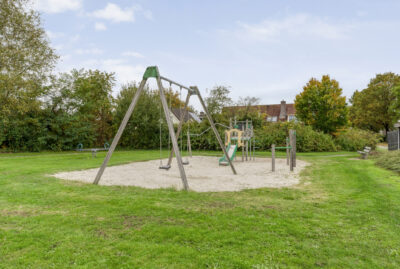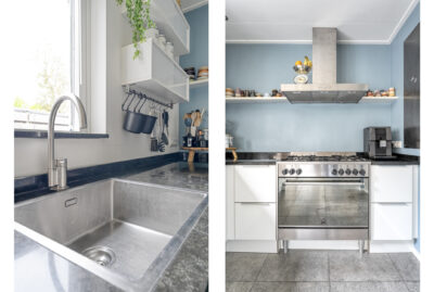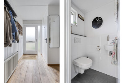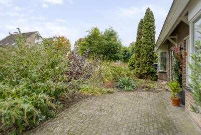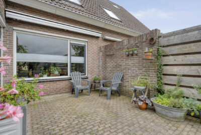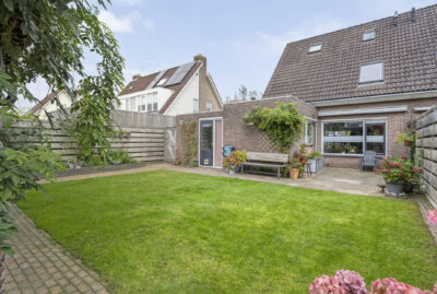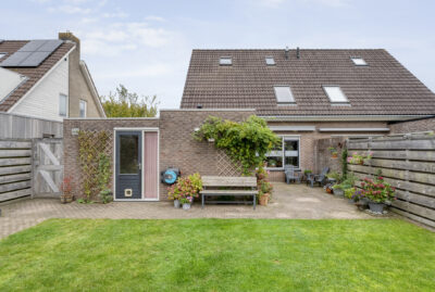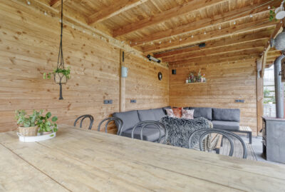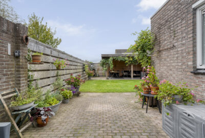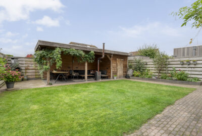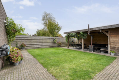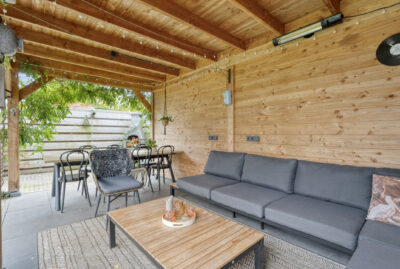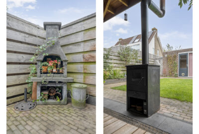 De achtertuin biedt voldoende privacy en beschikt over een berging (voor bijvoorbeeld het opbergen van de fietsen en het tuingereedschap) met overkapping, perfect om te loungen en ’s avonds heerlijk de houtkachel aan te steken.
