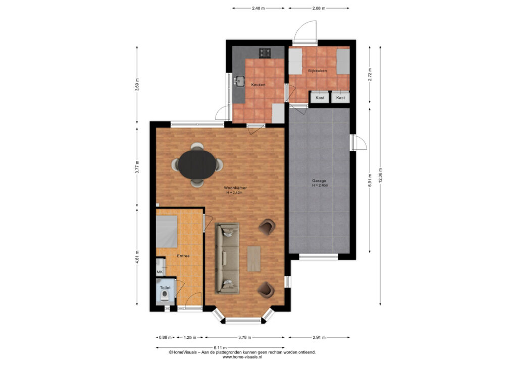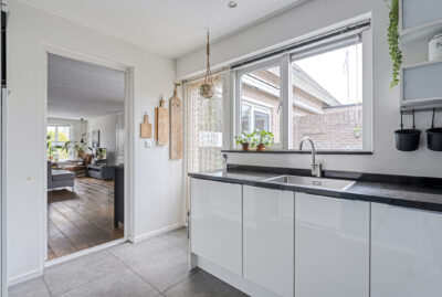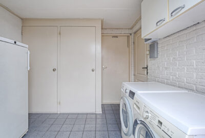 Vanuit de keuken is er toegang tot de praktische bijkeuken met de wasmachine-en droger aansluiting en vanuit de bijkeuken is er toegang tot zowel de garage als de op het westen gelegen achtertuin.