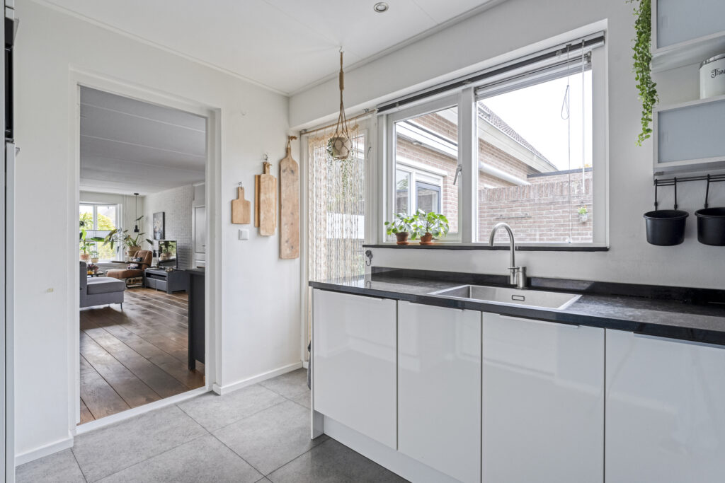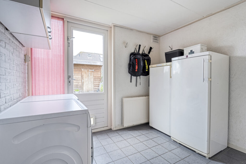 Vanuit de keuken is er toegang tot de praktische bijkeuken met de wasmachine-en droger aansluiting en vanuit de bijkeuken is er toegang tot zowel de garage als de op het westen gelegen achtertuin.