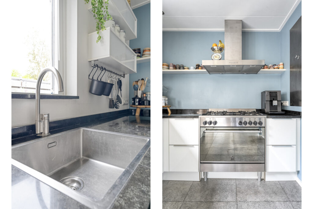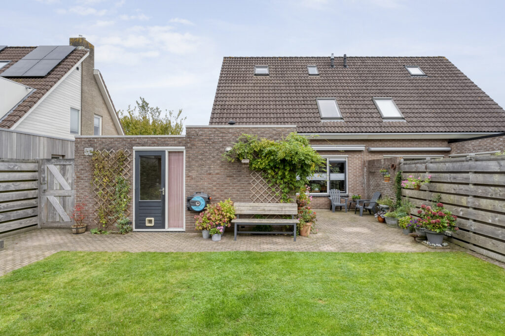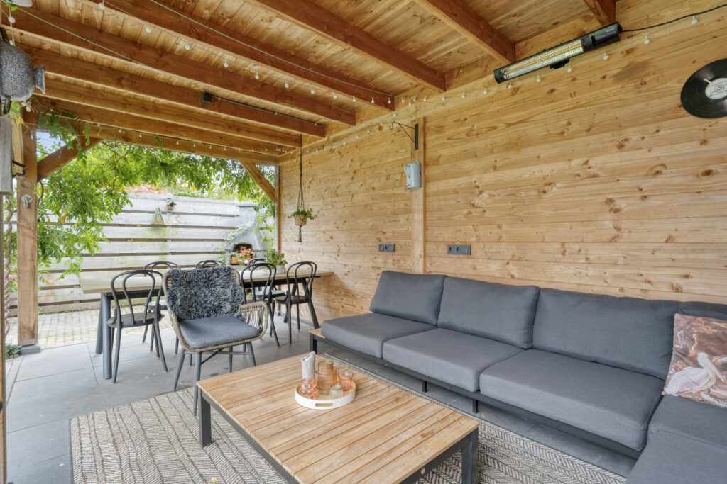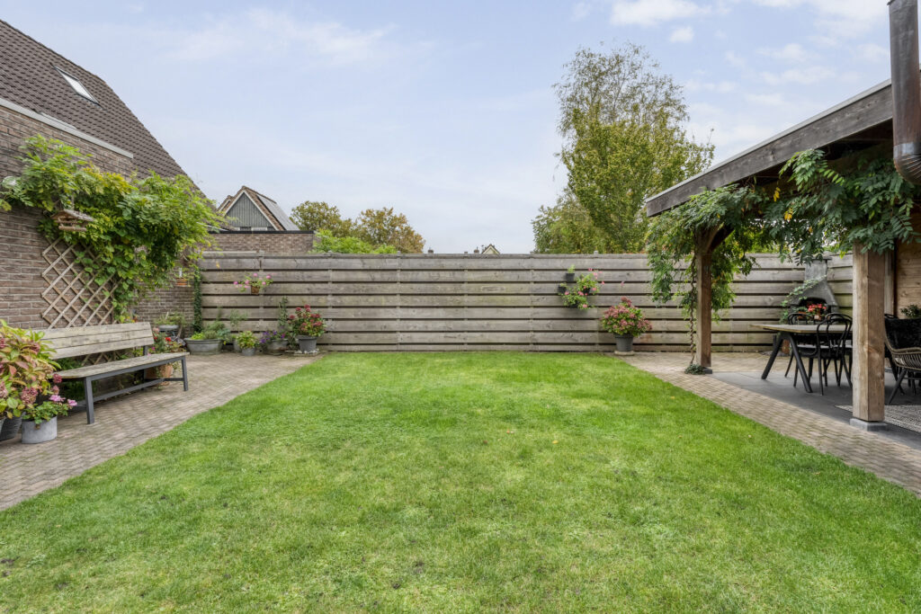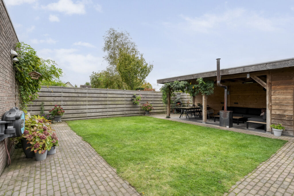 De achtertuin biedt voldoende privacy en beschikt over een berging (voor bijvoorbeeld het opbergen van de fietsen en het tuingereedschap) met overkapping, perfect om te loungen en ’s avonds heerlijk de houtkachel aan te steken.