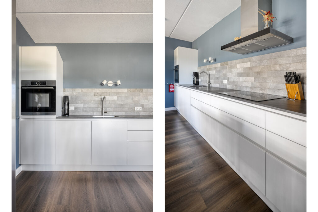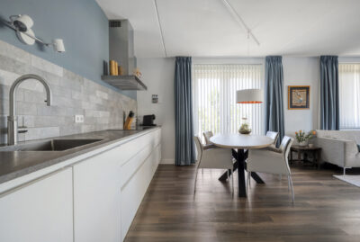 De woonkamer/keuken is ruim en licht en in 2021 voorzien van een nieuwe, luxe keuken met inbouwapparatuur en een quooker. Er is een losse combi koelkast/vriezer aanwezig.