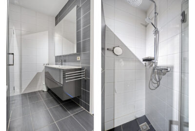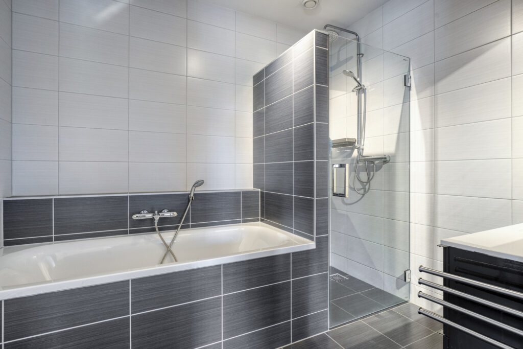 De moderne en ruime badkamer is voorzien van een ligbad, een inloopdouche, designradiator en wastafelmeubel.