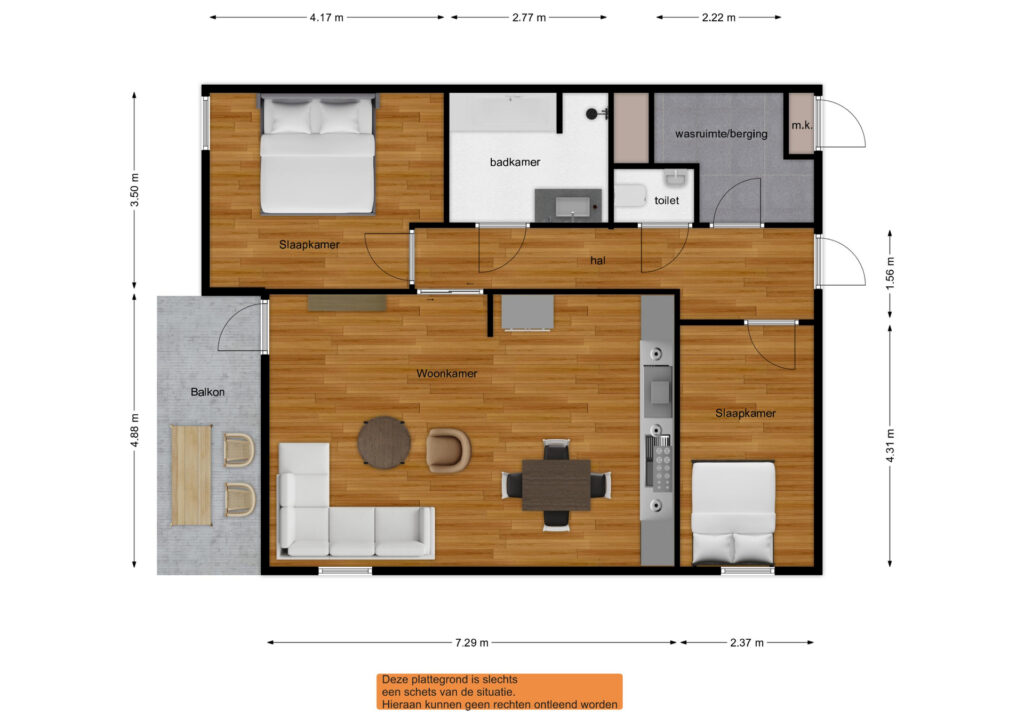 Het appartement beschikt over een ruime woonkamer met keuken, 2 slaapkamers, een badkamer, toilet en een praktische wasruimte.