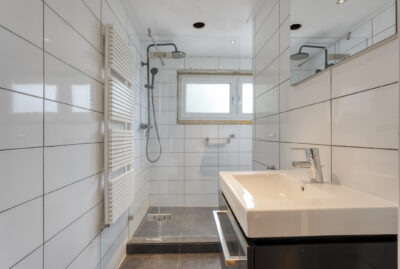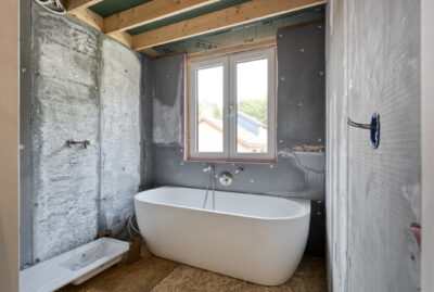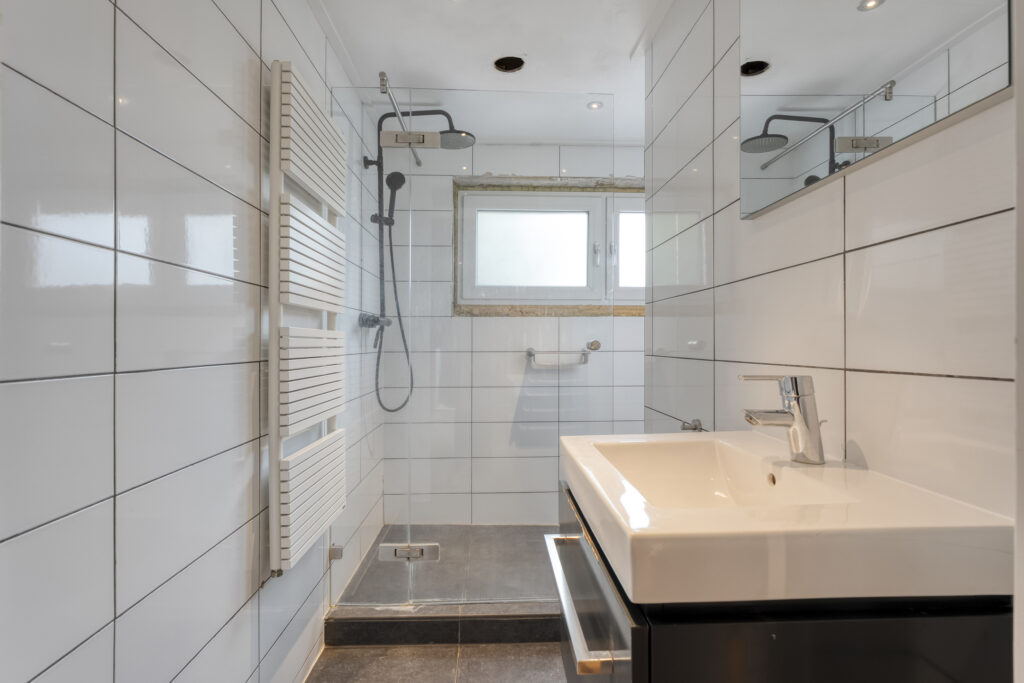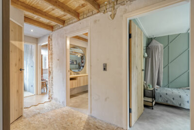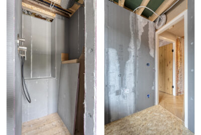 – De nieuwe badkamer bevindt zich in de uitbouw. Samen met de extra toiletruimte zijn alle voorbereidingen voor de afwerking gedaan, zodat u de afwerking naar uw eigen wens kunt voltooien.