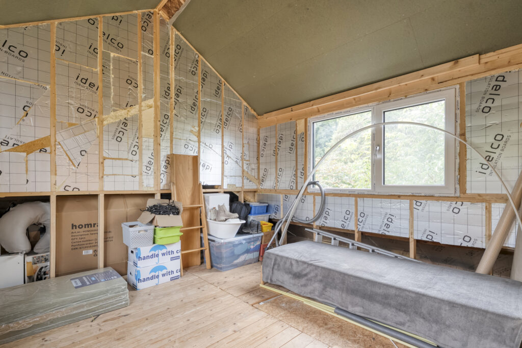 Deze is geïsoleerd, maar nog niet afgewerkt. Hier heeft u zelf de vrije hand in wat betreft indeling en afwerking. De tweede verdieping is bereikbaar met een vlizotrap.
