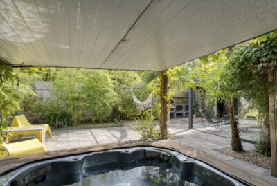 De tuin is een klein privéparadijsje met wintergroene beplanting. Hier kunt u het hele jaar door ontspannen en genieten dankzij de serre, buitendouche, jacuzzi en infrarood sauna.