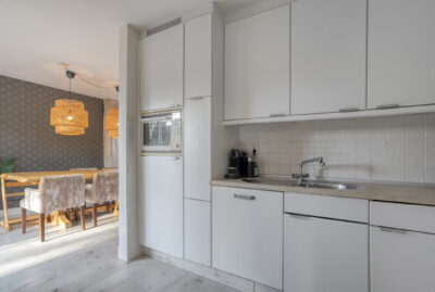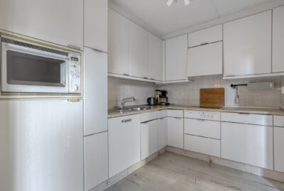 Er is een half open keuken met de nodige inbouwapparatuur, een praktische bijkeuken met toegang tot de aangebouwde garage, de achtertuin en de slaapkamer met eigen badkamer.