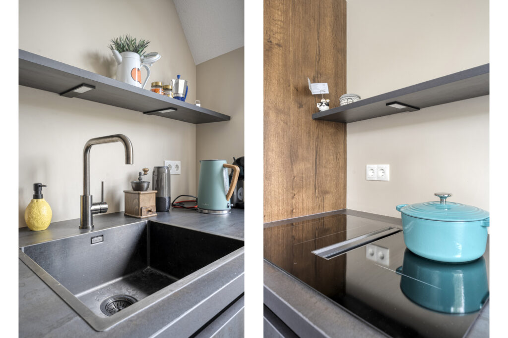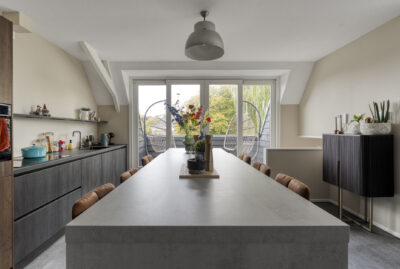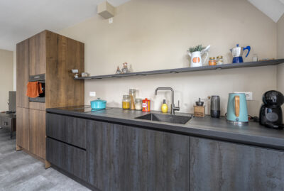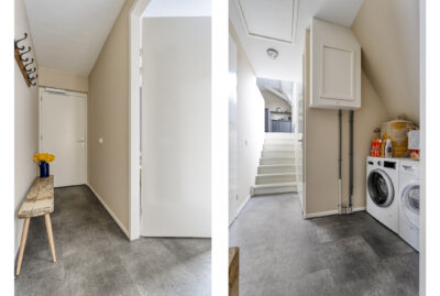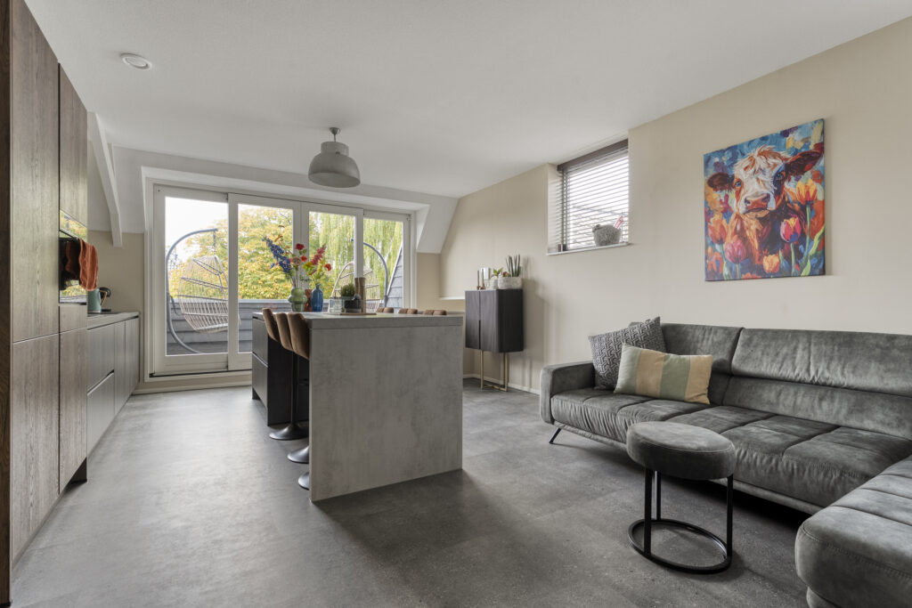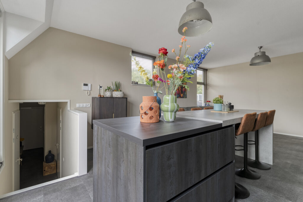 Via de gang en een korte trap kom je in de moderne en lichte woonkamer en keuken.