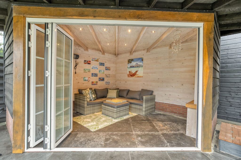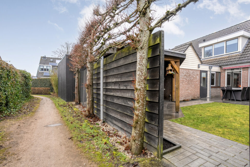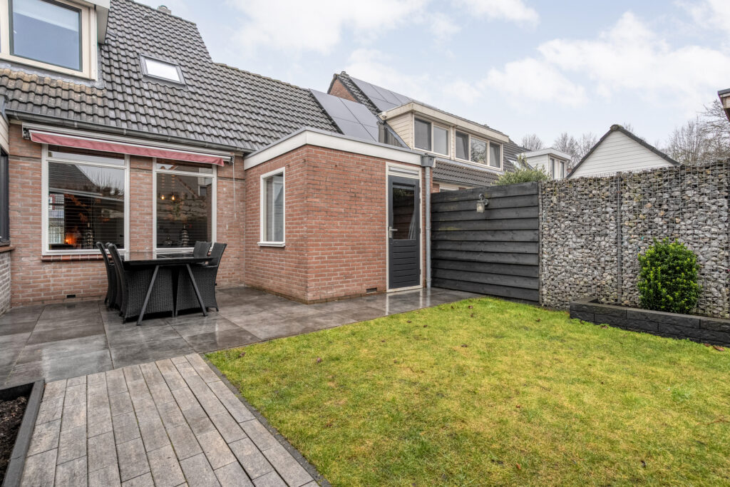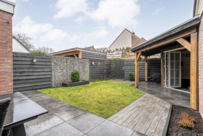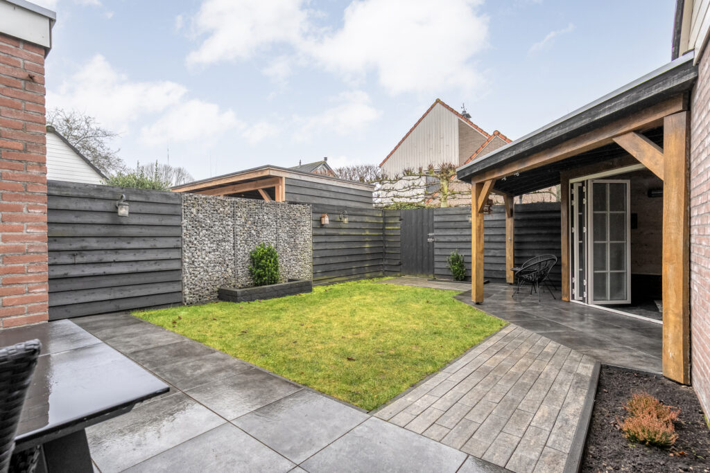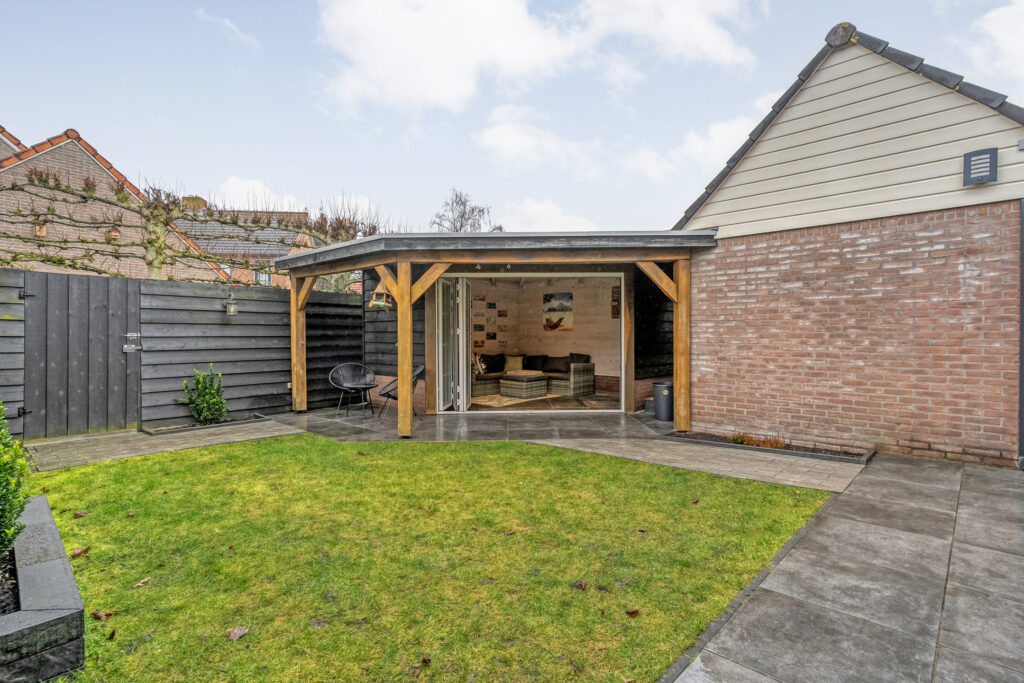 De achtertuin is verzorgd aangelegd en biedt een heerlijke plek om te ontspannen. Het fraaie tuinhuis met overkapping maakt het plaatje compleet: een perfecte plek om tot in de late uurtjes buiten te zitten, ongeacht het seizoen.