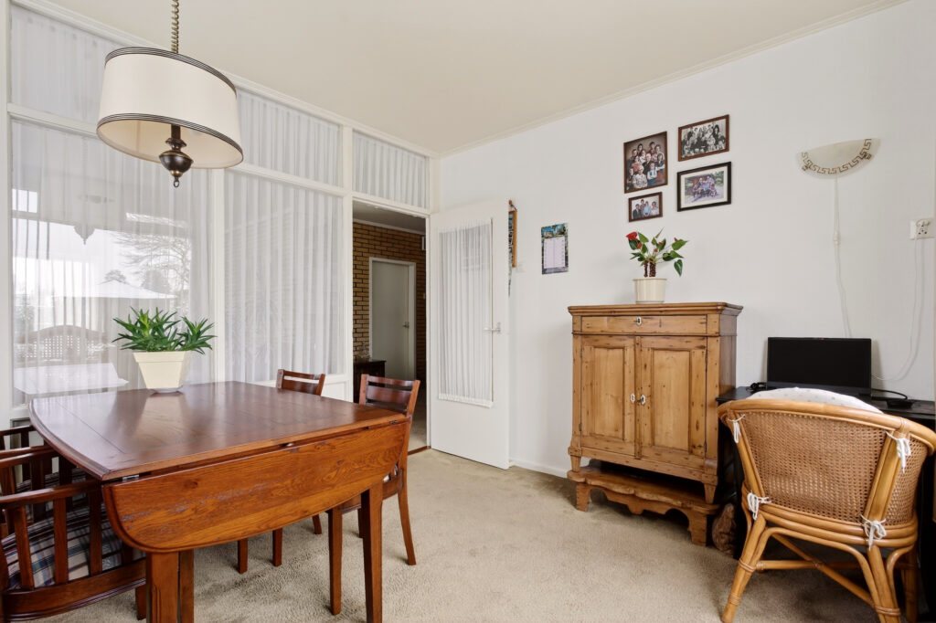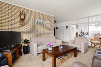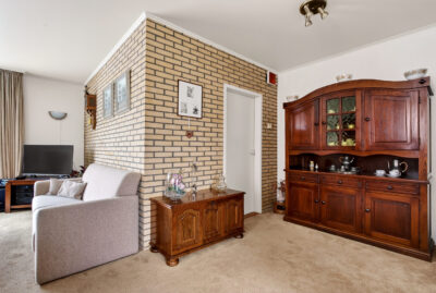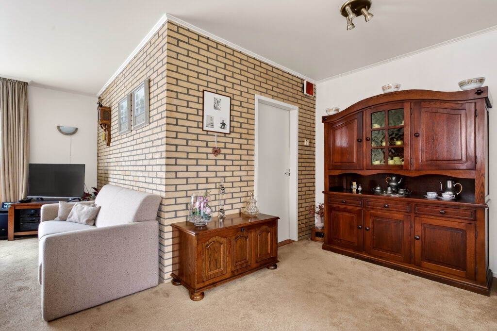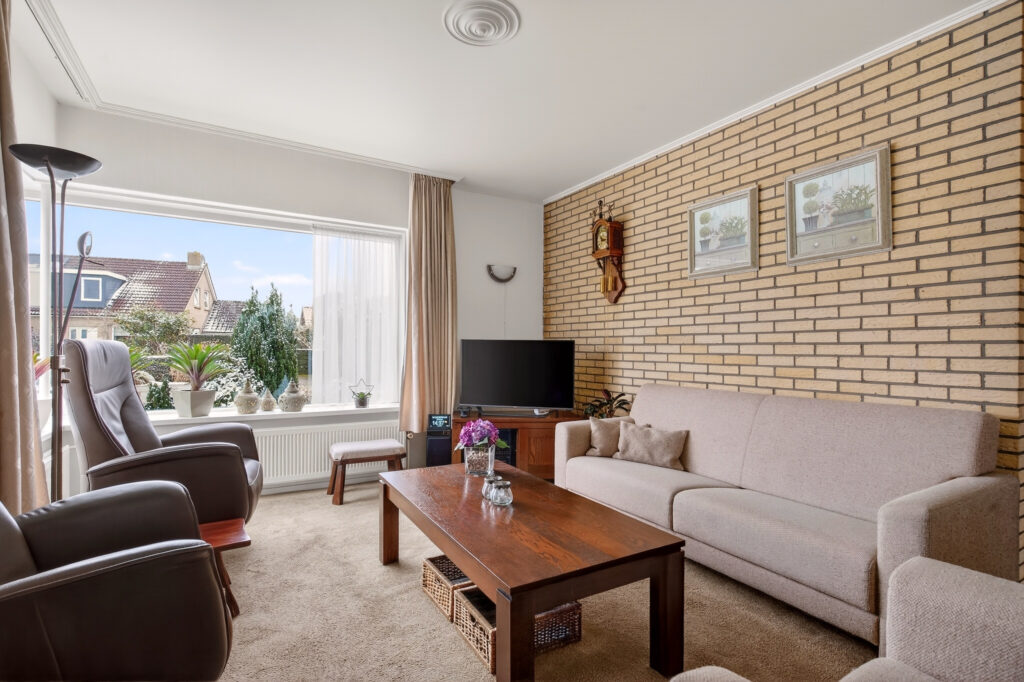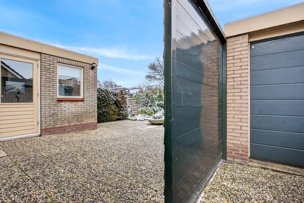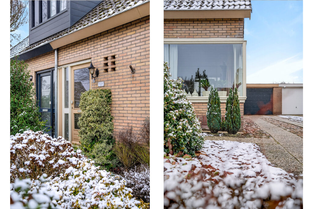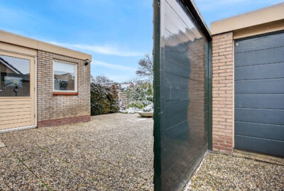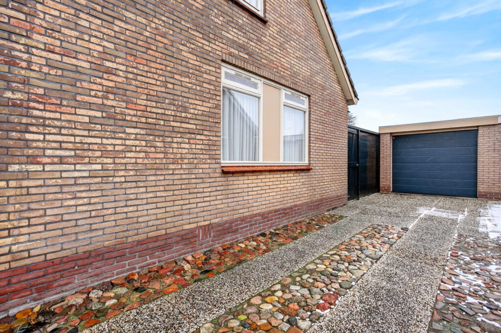 Buiten is de voortuin en een ruime oprit naar de stenen garage. De auto parkeren kan dus op eigen terrein.