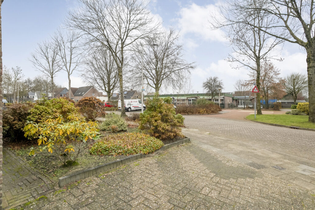 De voortuin heeft een ruime oprit voor het parkeren van de auto en een fraaie border met planten en struiken.