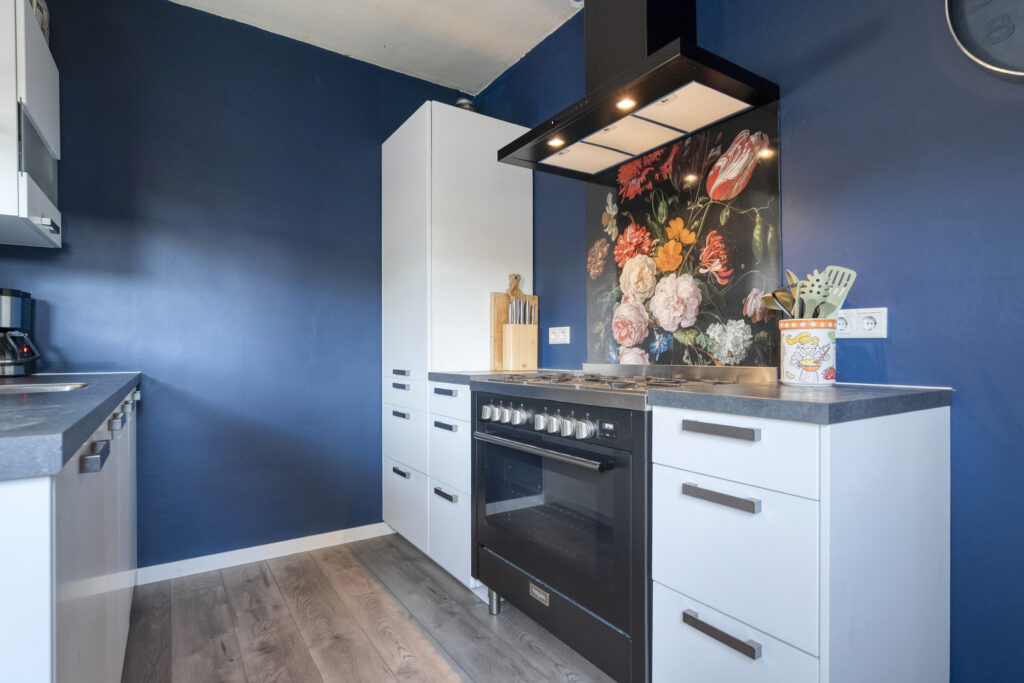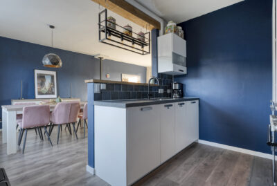 De open keuken is praktisch ingericht en biedt voldoende kastruimte en inbouwapparatuur.