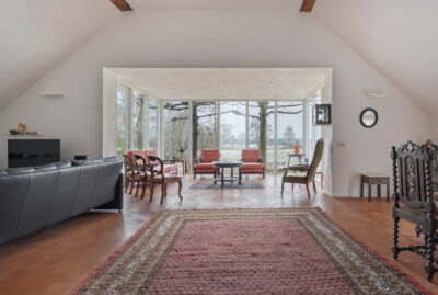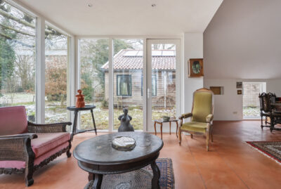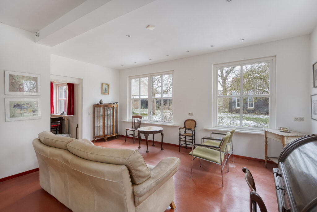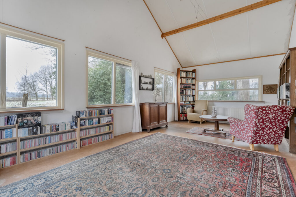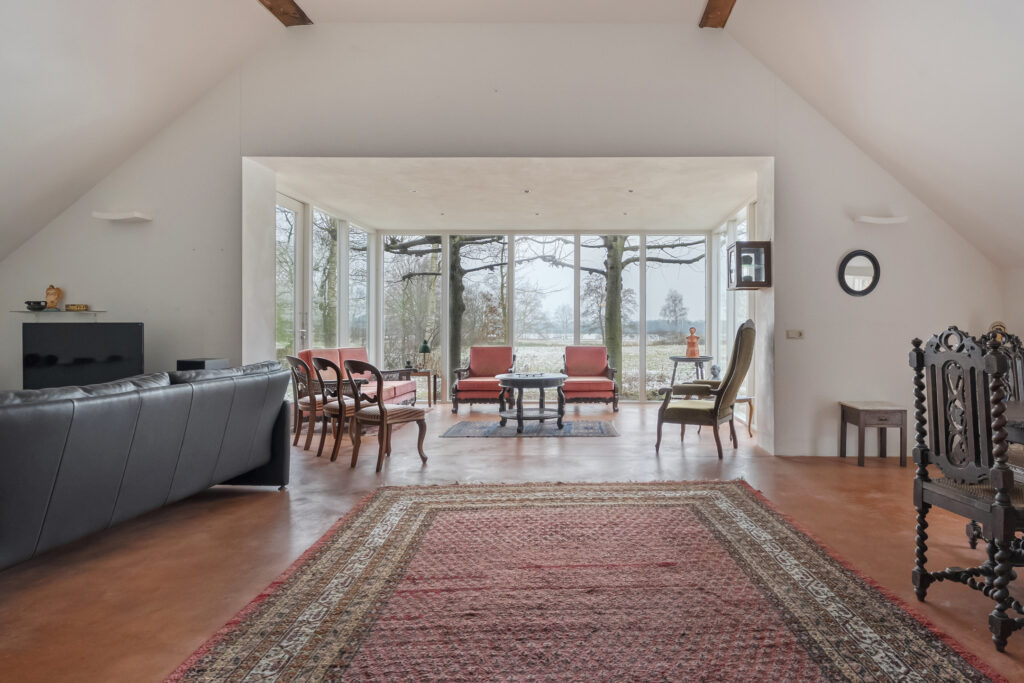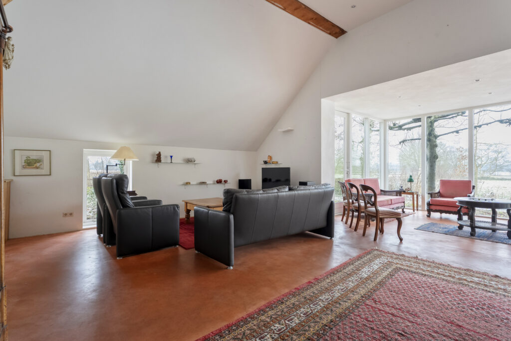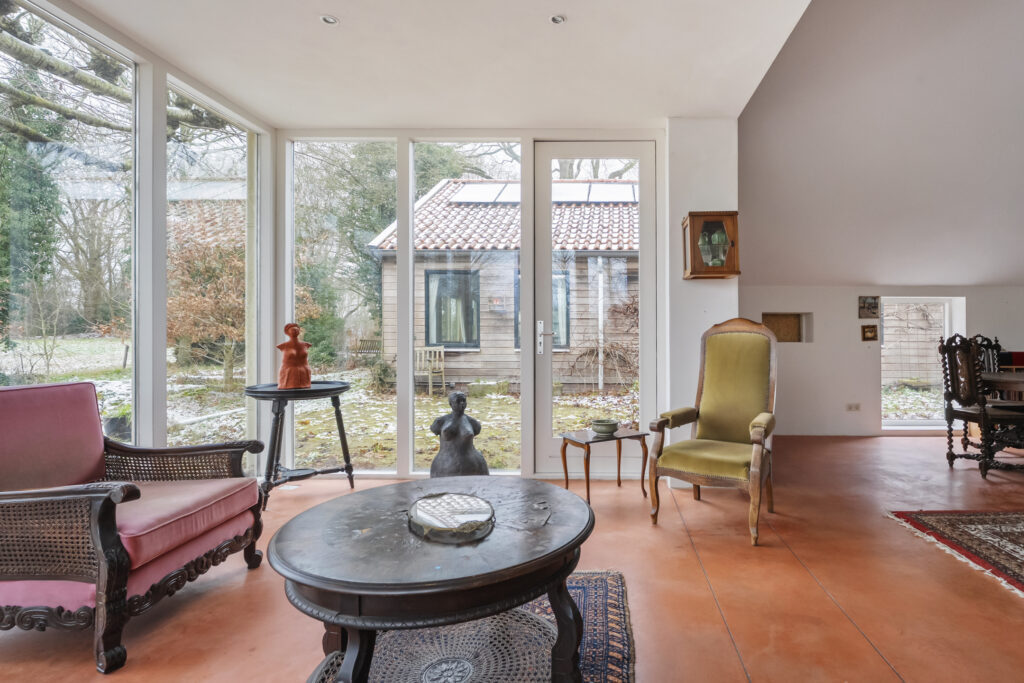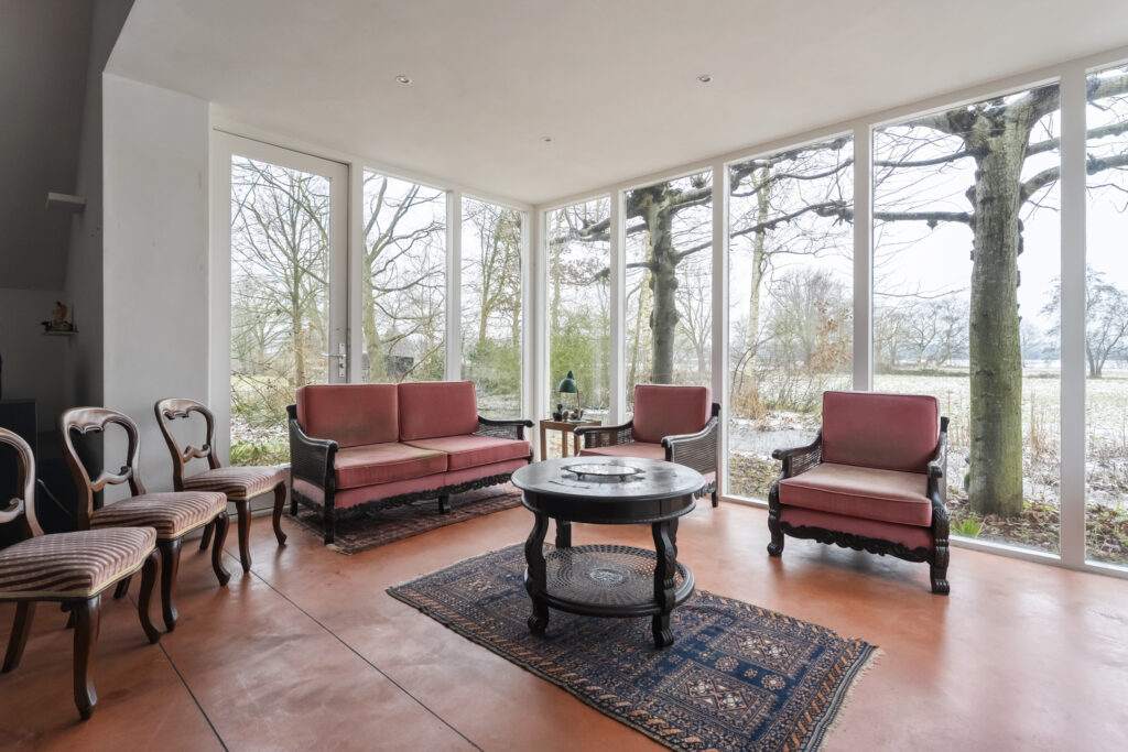 Deze woonkamer heeft een aangebouwde serre met prachtig uitzicht over de weilanden.
